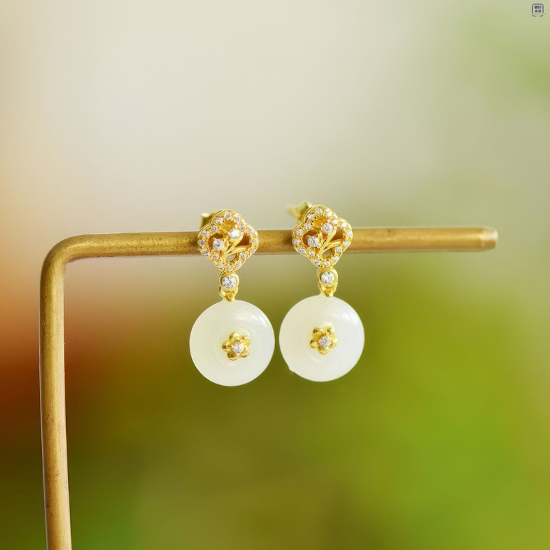 In the bustling world, seek a sense of tranquility and elegance. The Floral Whisper Peace Charm Earrings, with the gentle luster of white Hetian jade paired with exquisite golden design, integrate the beauty of nature into your daily attire. Each round peace charm symbolizes completeness and harmony, reflecting your deep love and pursuit of life within.