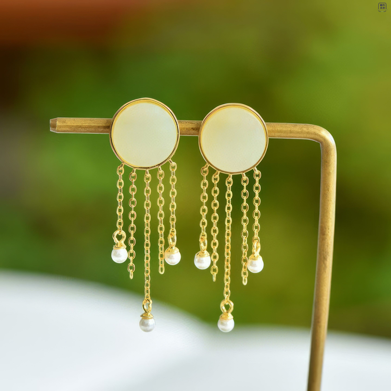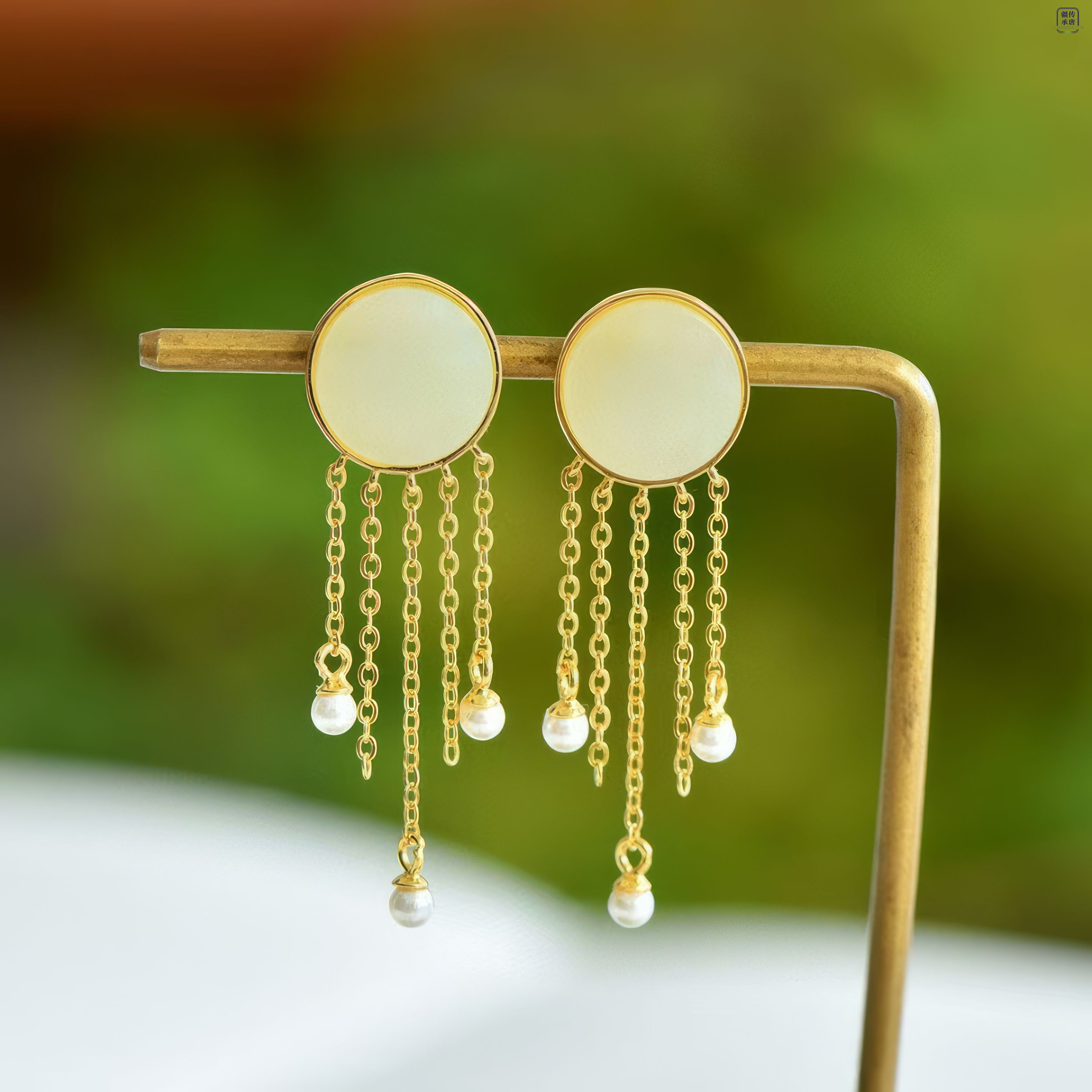 "Moonlight Tassel," a fusion of classical and modern elements in white Hetian jade jewelry. The round white Hetian jade symbolizes completeness and harmony, while the golden chains add a touch of fashion. Each tassel is like a ribbon hanging down from the moon, light and graceful, as if leading you into a dreamlike world.